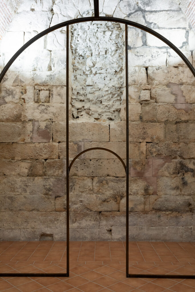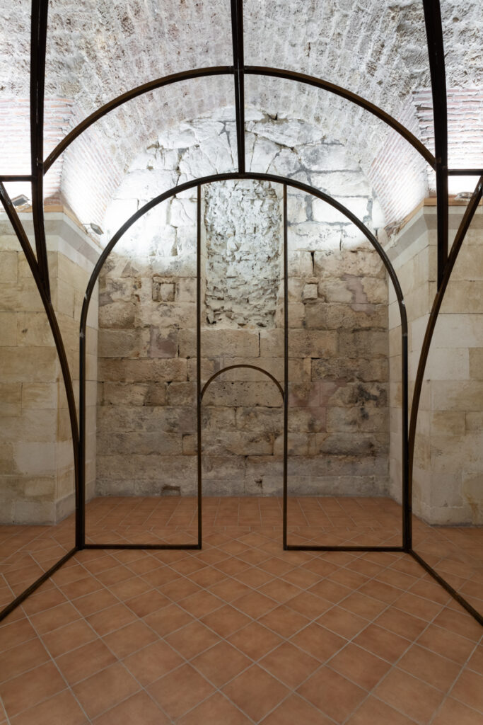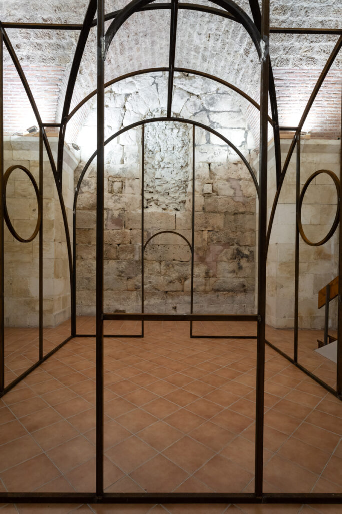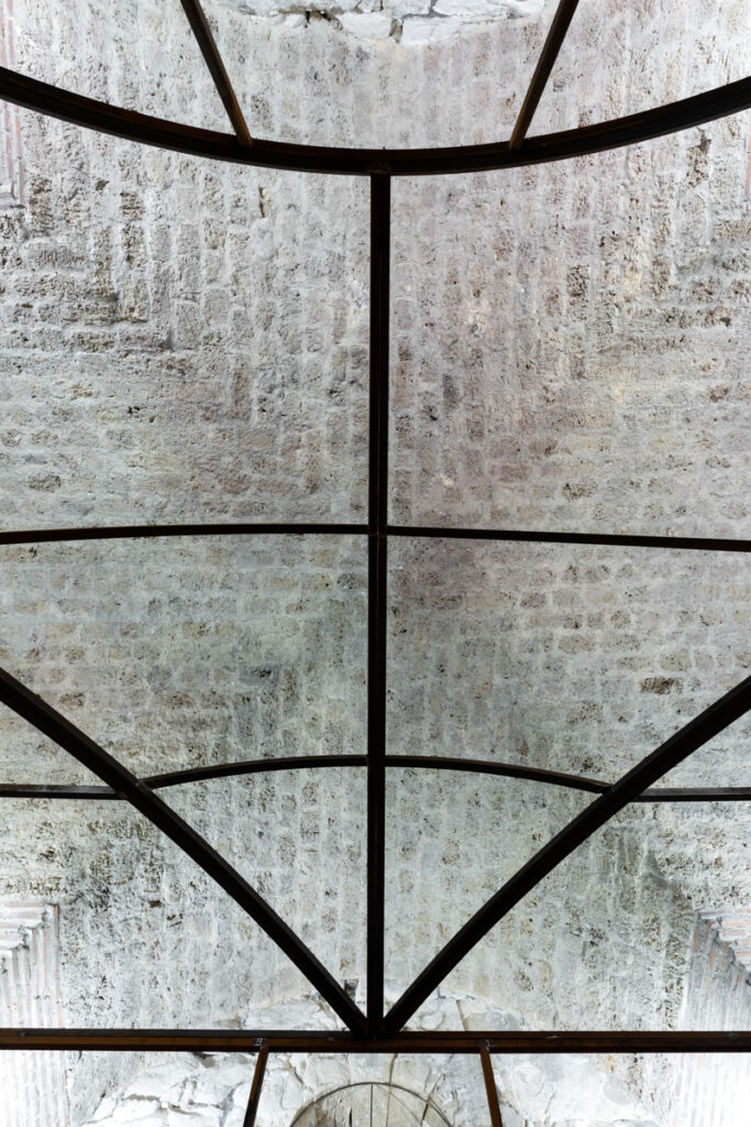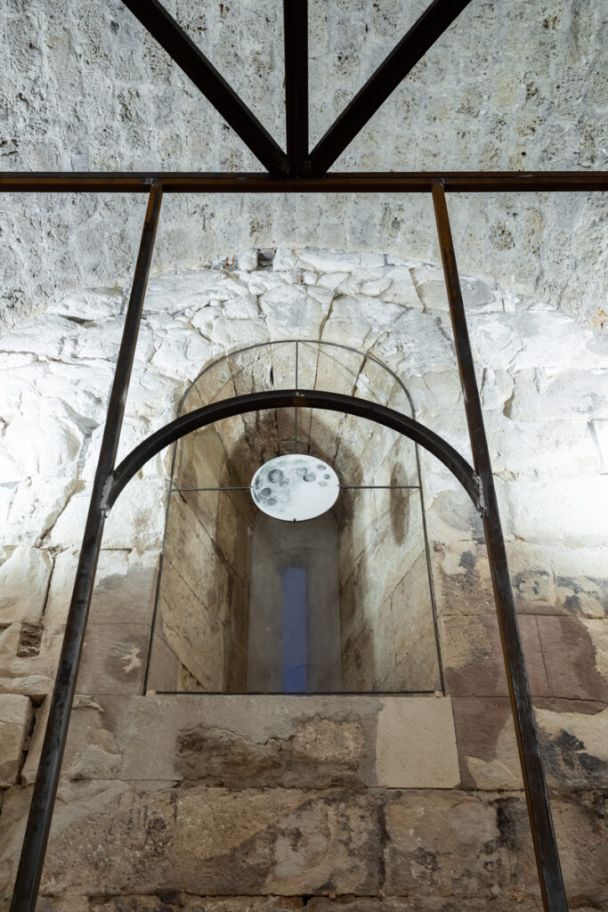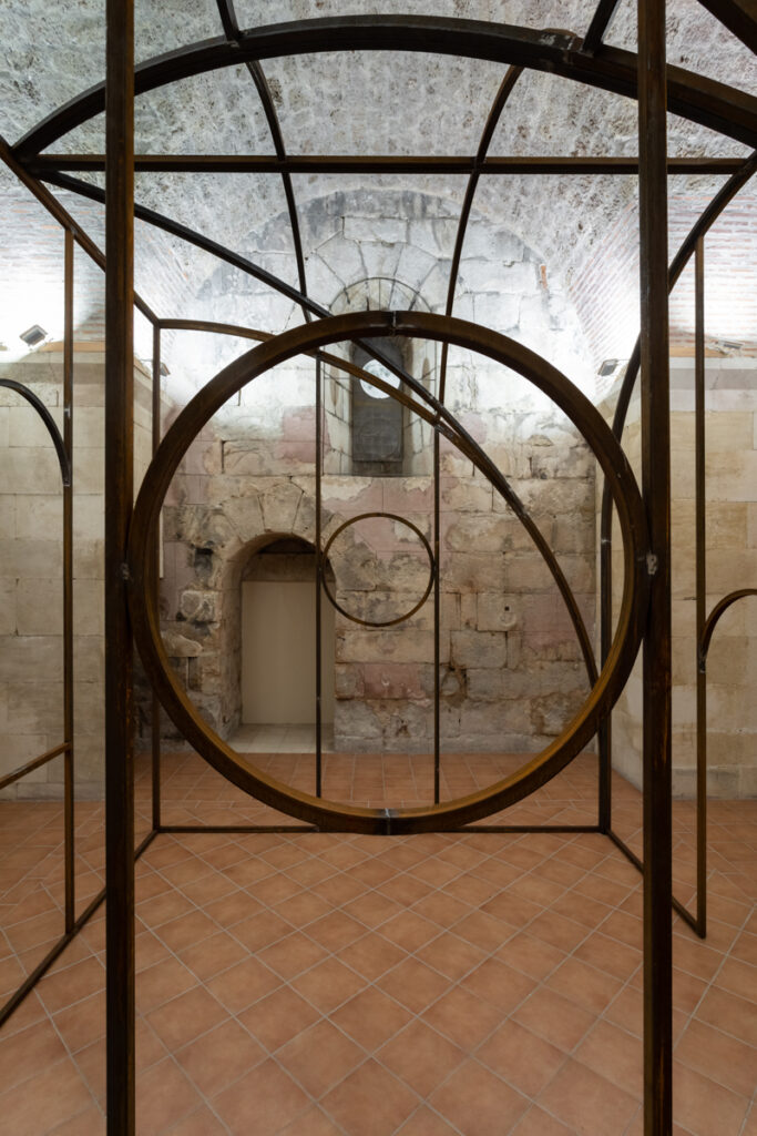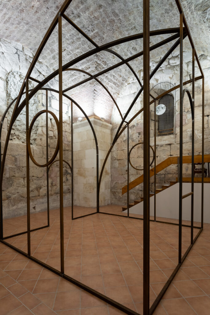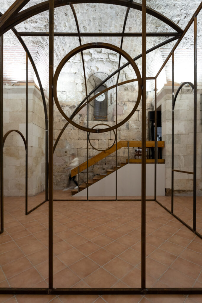 On this occasion, Kula Gallery presents a work by Oscar Tuazon, a structure that can be described equally as sculpture and as architecture, though this duality is far more than a formal conceit. What we encounter is a structure poised between the load-bearing and the fragile, between shelter and gesture, between the space we inhabit and the space that, in turn, shapes us. Within the stone body of the Kula (Eng. tower), whose history already carries connotations of protection and a certain architectural verticality, Tuazon’s intervention operates as a temporary organism, one that does not assert itself as an eternal object. It presents itself as an ongoing process, a construction that implies the potential for addition, disassembly and modification. The meeting of the ephemeral and the transient with the historical continuity of the stone walls produces no excessive tension, nor does it register as an unnecessary intrusion into an already articulated interior. Rather, Tuazon constructs an interior within an interior, a space that reshapes the very concept of the enclosed volume. In doing so, the ephemeral does not rival the enduring but instead animates it from within, making it porous. The historic walls assume the role of a resonant membrane for a contemporary act of construction, while the work calls forth an archetypal impulse towards shelter.
